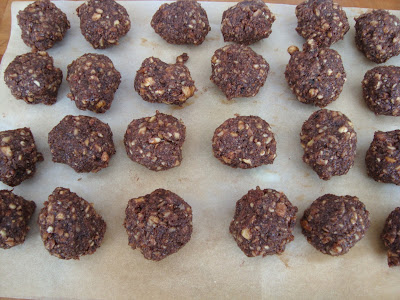 Може да се направят и на по-големи парчета,като се оформи сместа на руло,увива се в алуминиево фолио и се прибере в хладилника за 4-5 часа.След това се реже на парчета заедно с фолиото и след това внимателно се отстранява фолиото от всяко парче.И тогава се потапя в шоколада- въпрос на вкус.
